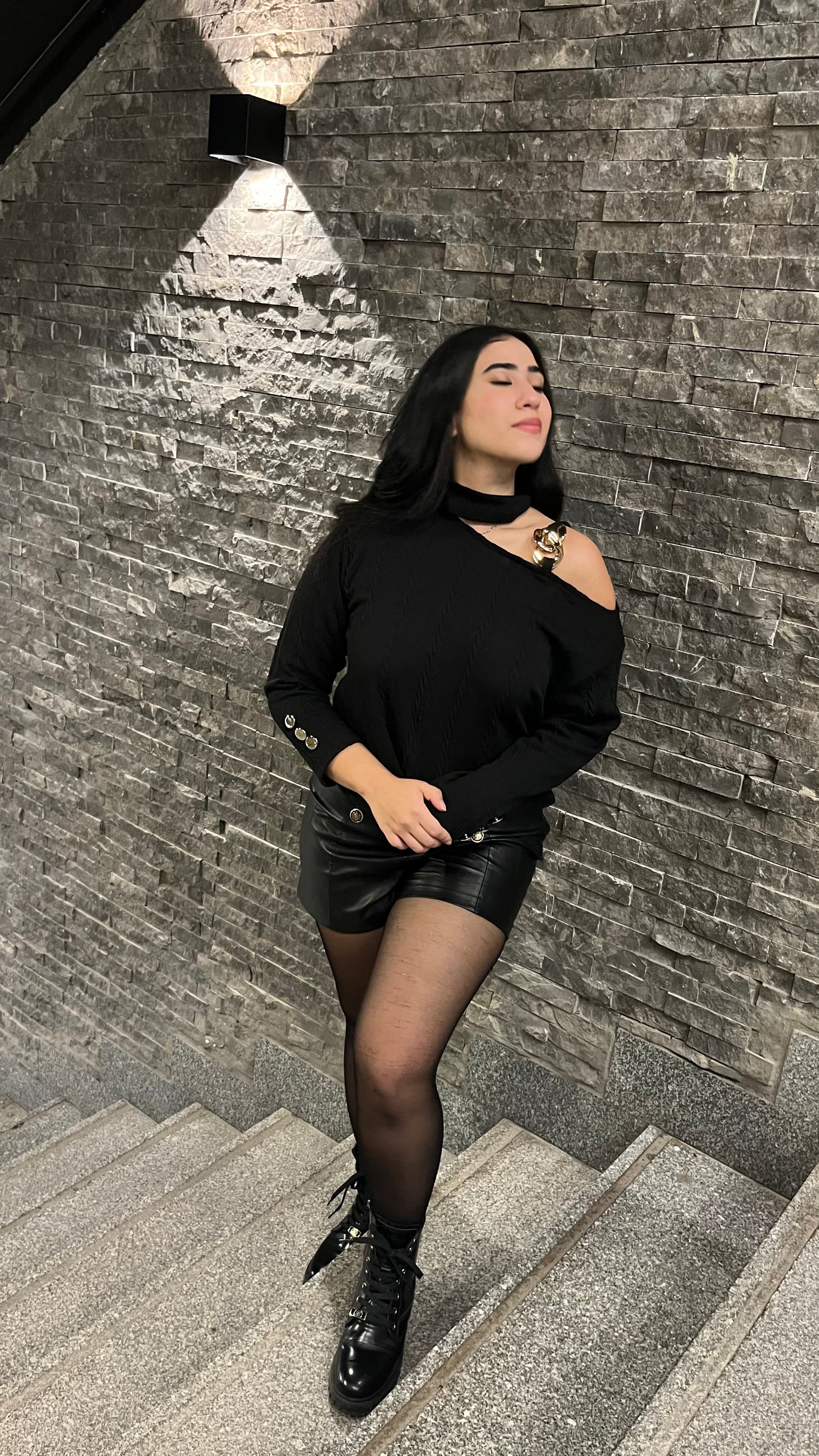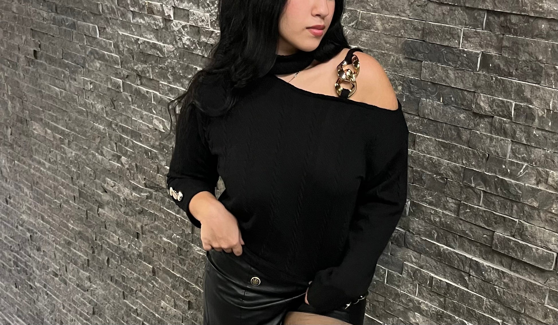 A modern take on effortless edge — this asymmetrical black knit features a bold chain-strap cutout shoulder, sculpted neckline, and polished metal button cuffs. Soft, structured, and striking all at once, it blends minimal design with statement hardware for a look that’s both understated and unforgettable.