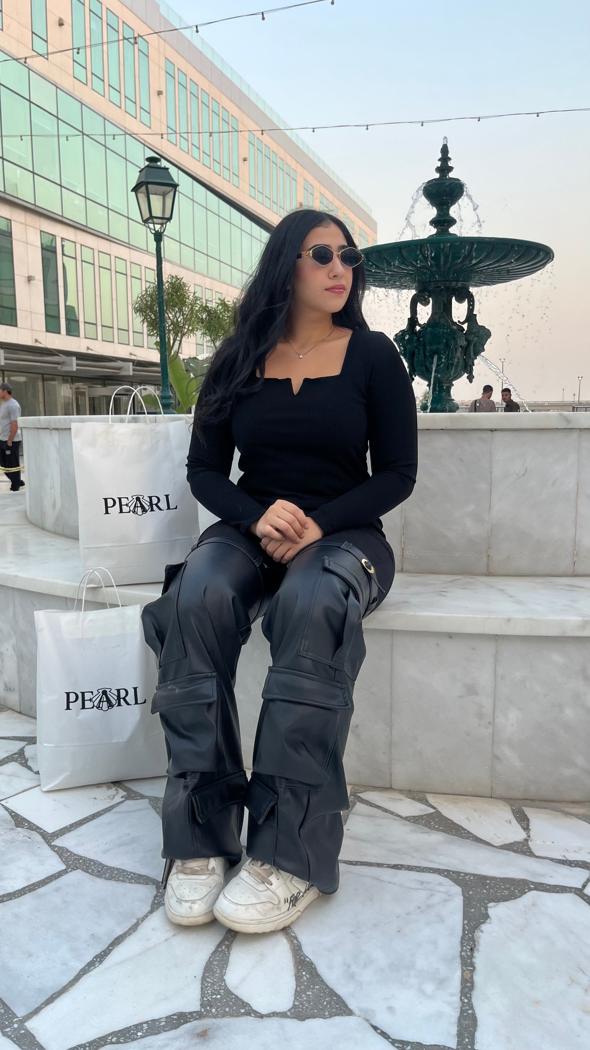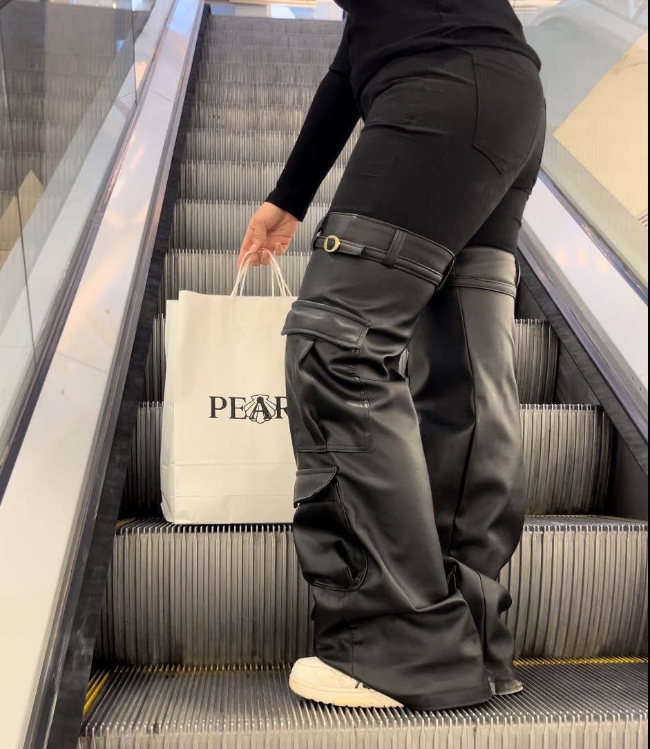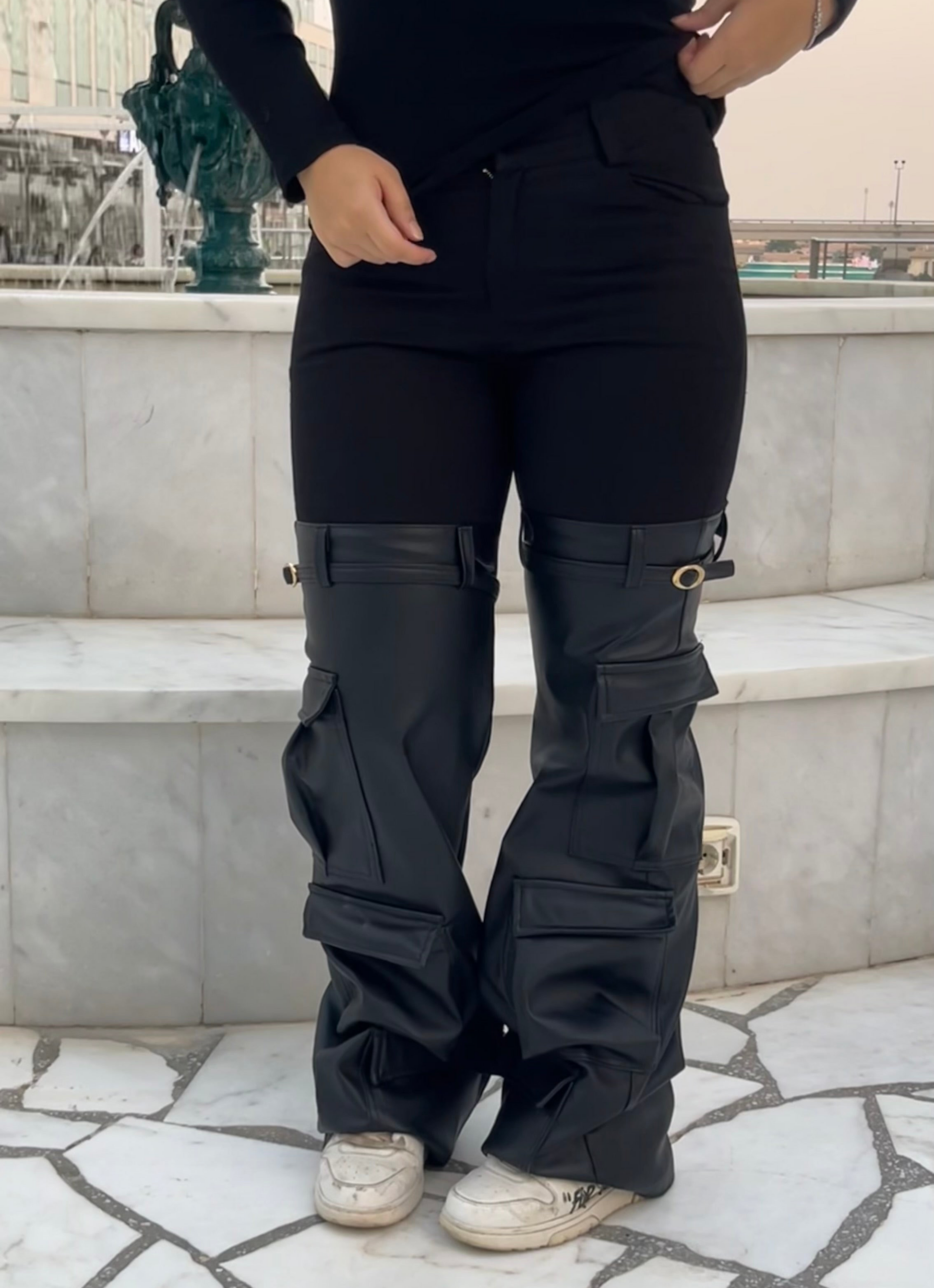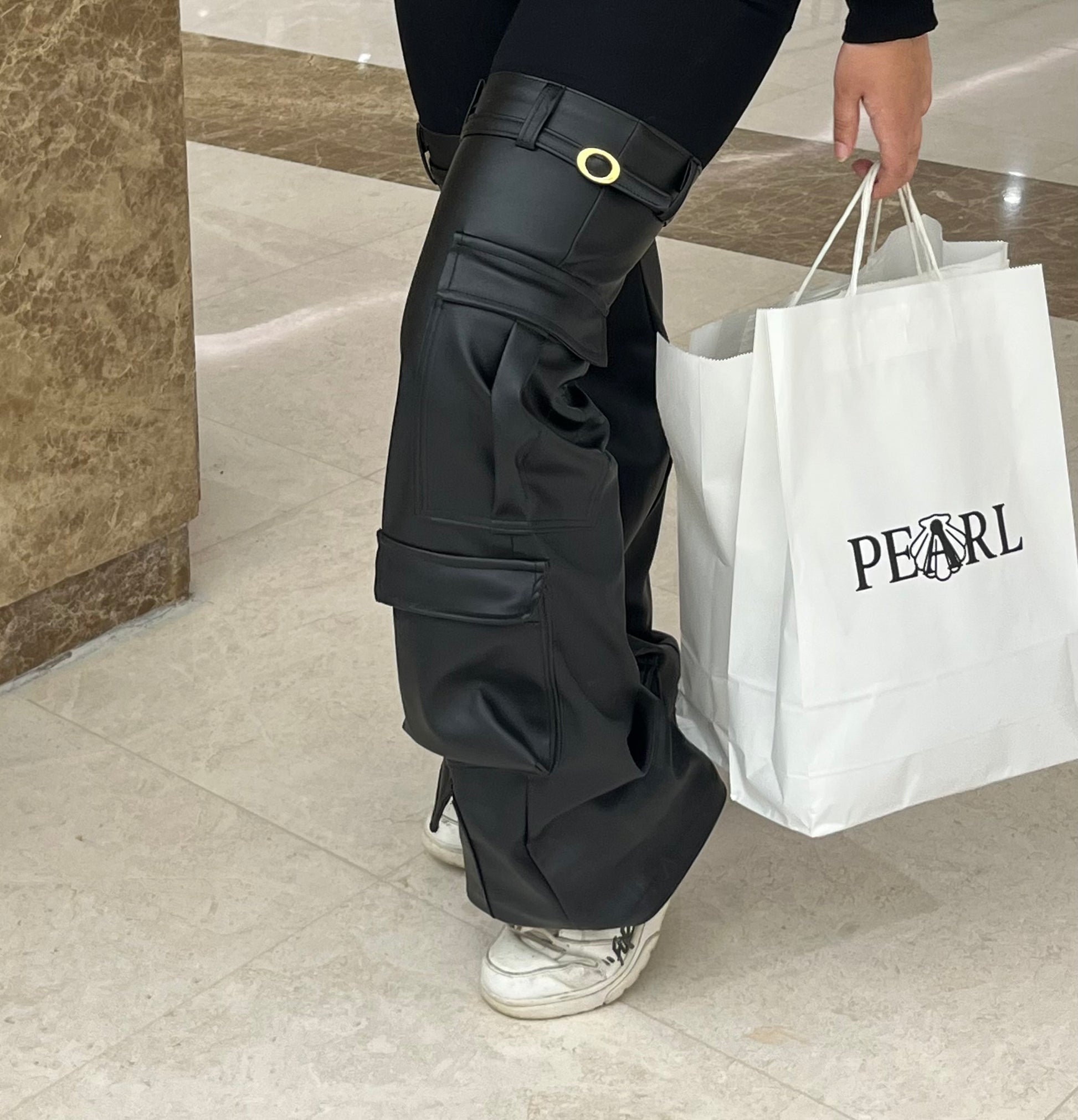 A bold fusion of streetwear and utility, designed in sleek black faux leather with exaggerated pockets, metal hardware, and a wide stacked silhouette. Built for movement, attitude, and modern edge—these cargos turn everyday wear into a statement.